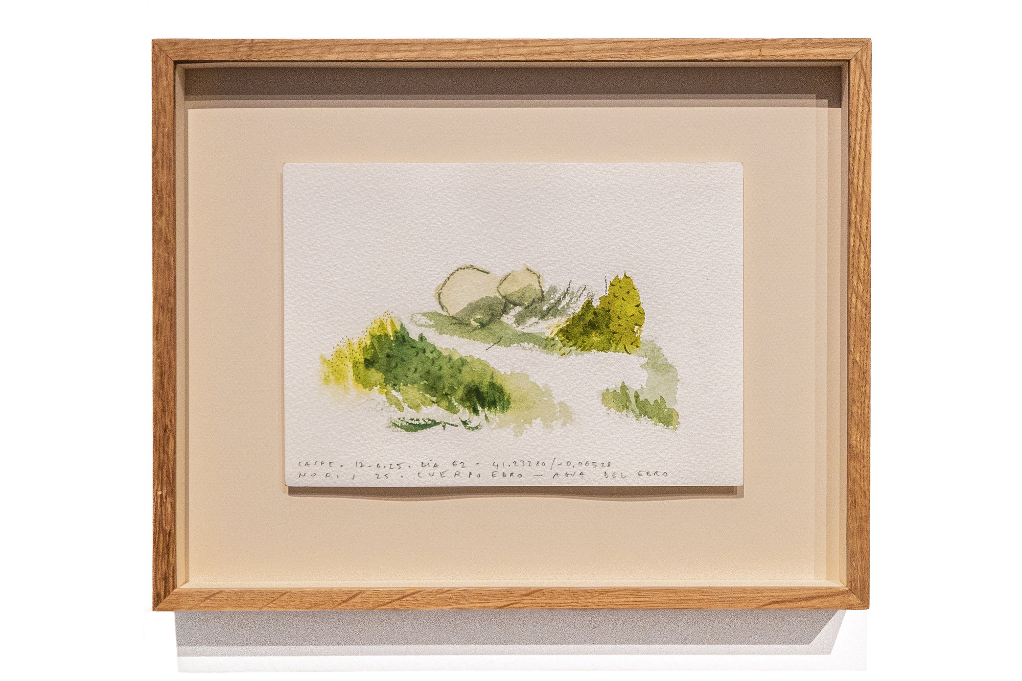 Esta acuarela, realizada en 2025, pertenece a una serie de obras realizadas durante la travesía del proyecto Cuerpo Ebro. El artista utiliza agua del propio río para “imprimir memoria” sobre papel, subrayando la relación entre camino, paisaje y tiempo.