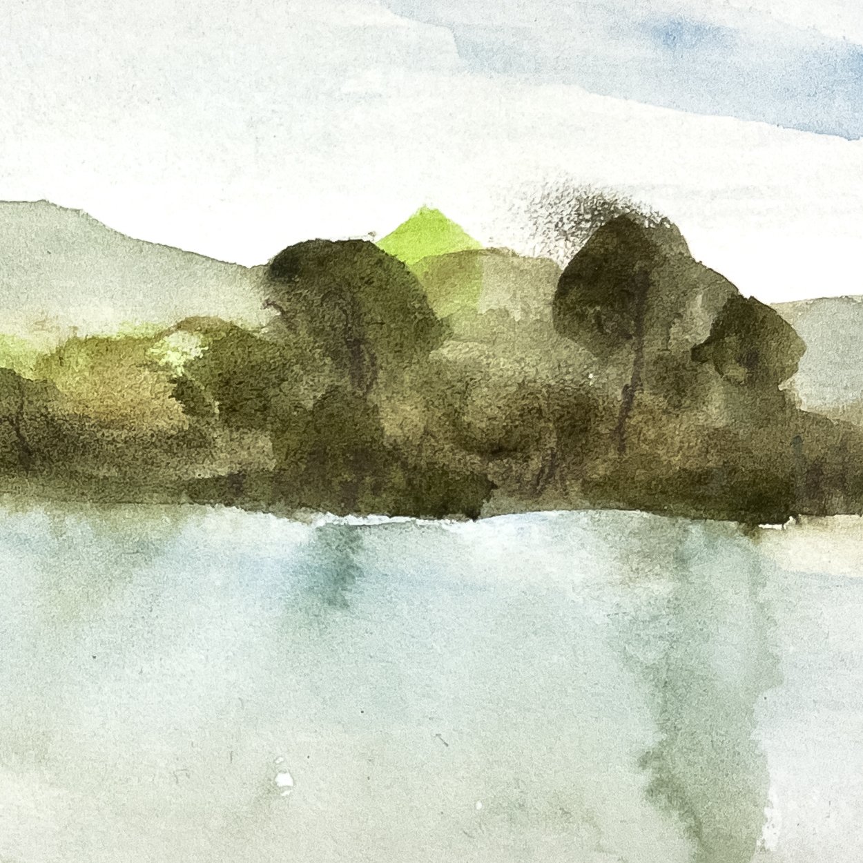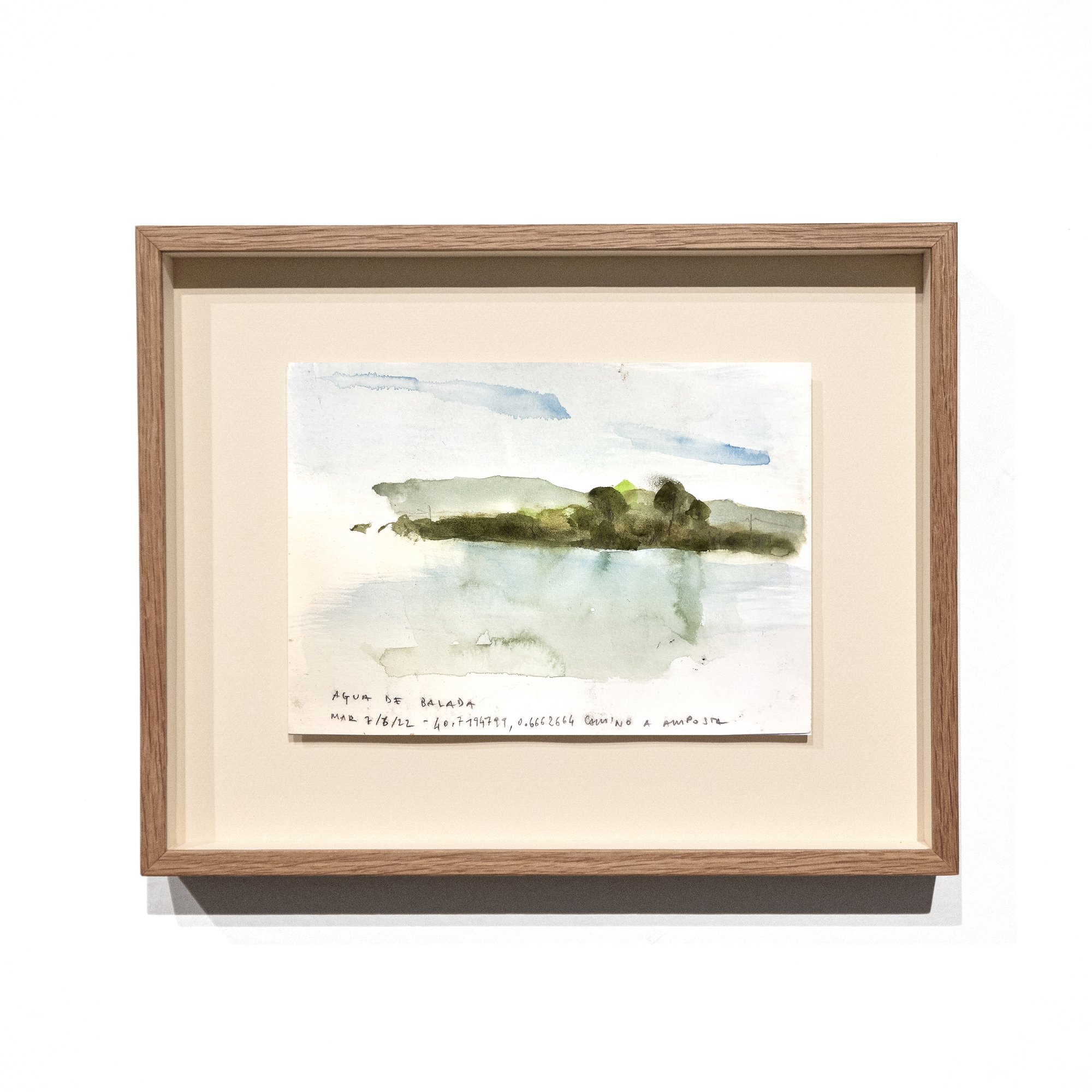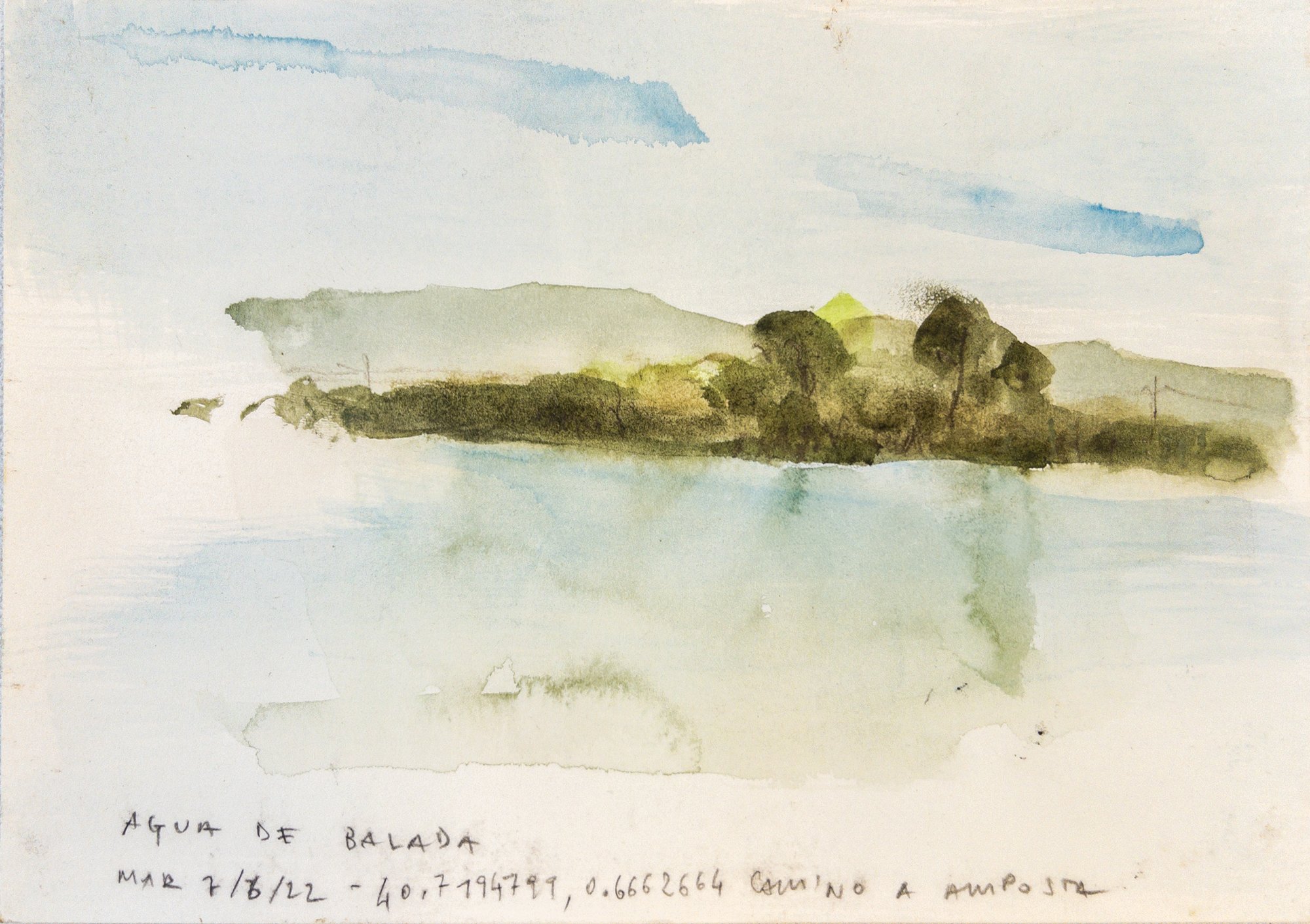 Esta acuarela, realizada en 2022, pertenece a una serie de 47 obras realizadas durante la travesía del proyecto Sequere. El artista utiliza agua del propio río para “imprimir memoria” sobre papel, subrayando la relación entre camino, paisaje y tiempo.