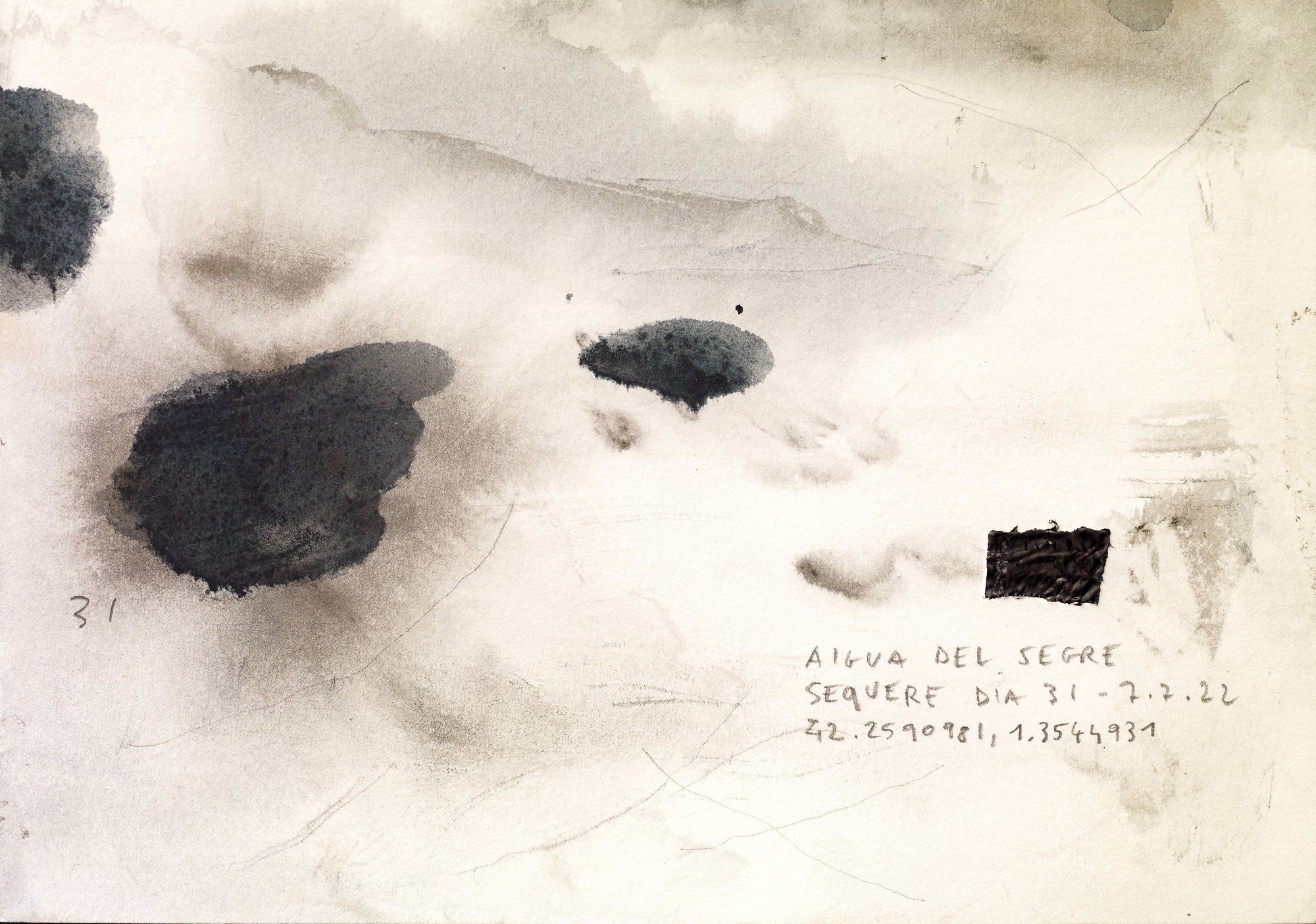 Esta acuarela, realizada en 2022, pertenece a una serie de 47 obras realizadas durante la travesía del proyecto Sequere. El artista utiliza agua del propio río para “imprimir memoria” sobre papel, subrayando la relación entre camino, paisaje y tiempo.