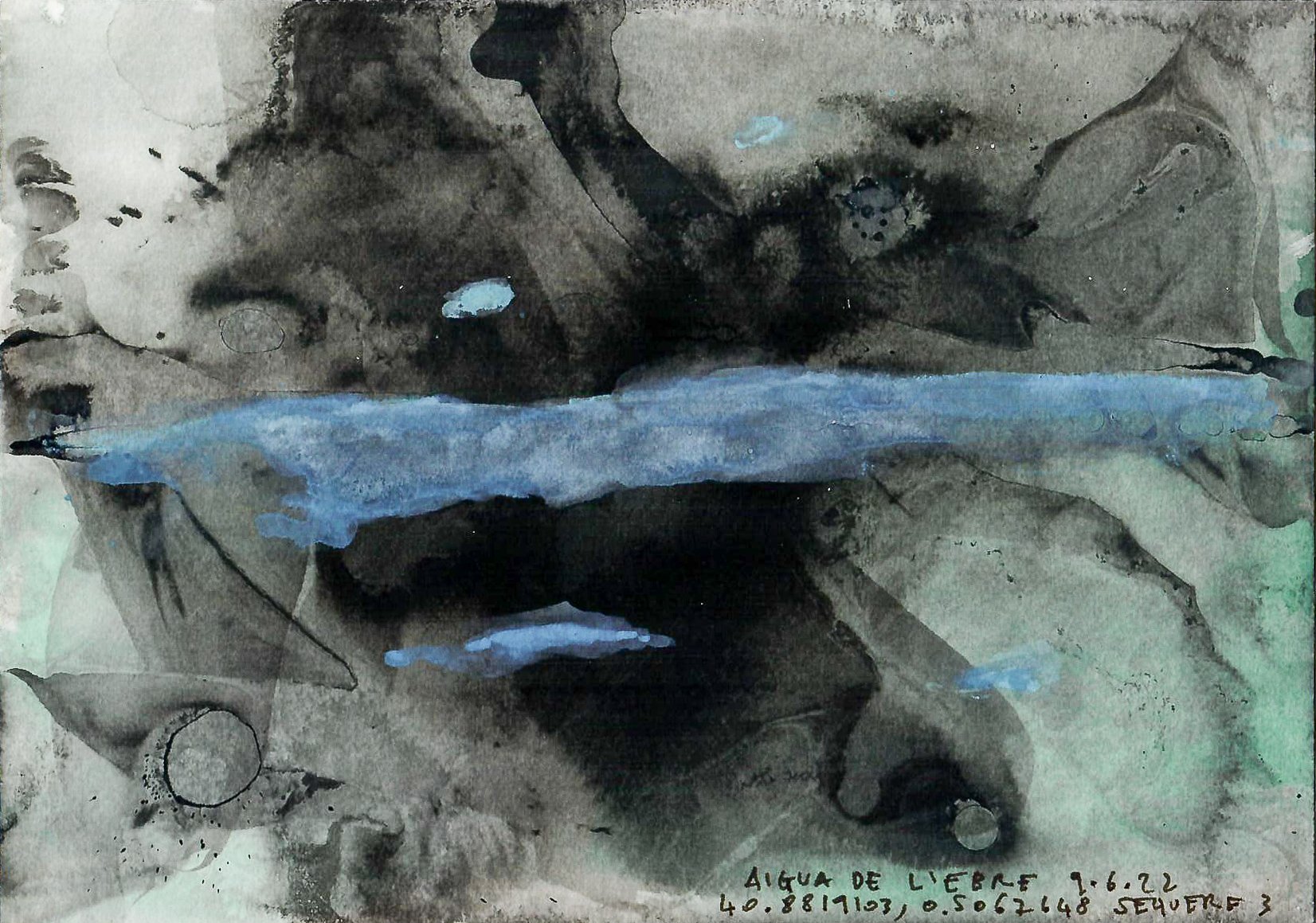 Esta acuarela, realizada en 2022, pertenece a una serie de 47 obras realizadas durante la travesía del proyecto Sequere. El artista utiliza agua del propio río para “imprimir memoria” sobre papel, subrayando la relación entre camino, paisaje y tiempo.